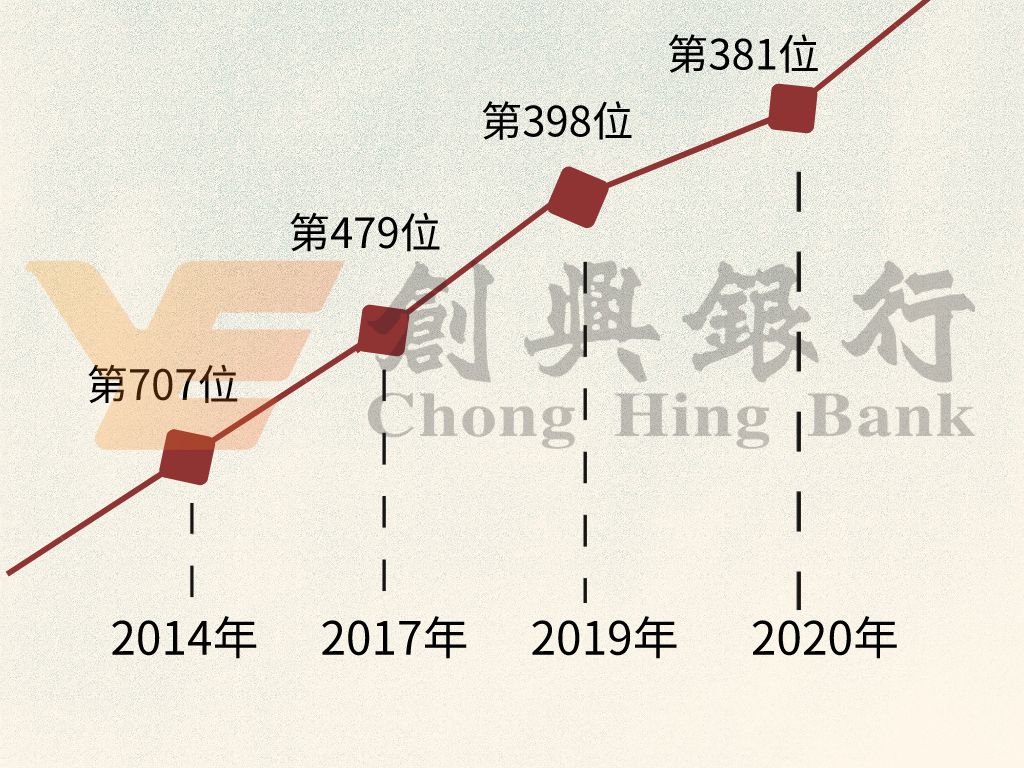 继去年首次跻身排名榜前400强,创兴银行今年进一步攀升至第381位,较去年上升17位。创兴银行已连续多年入选“全球银行1000强”榜单,经过不断的拼搏,10年间排名跃升了306位,显示综合实力显著提升。