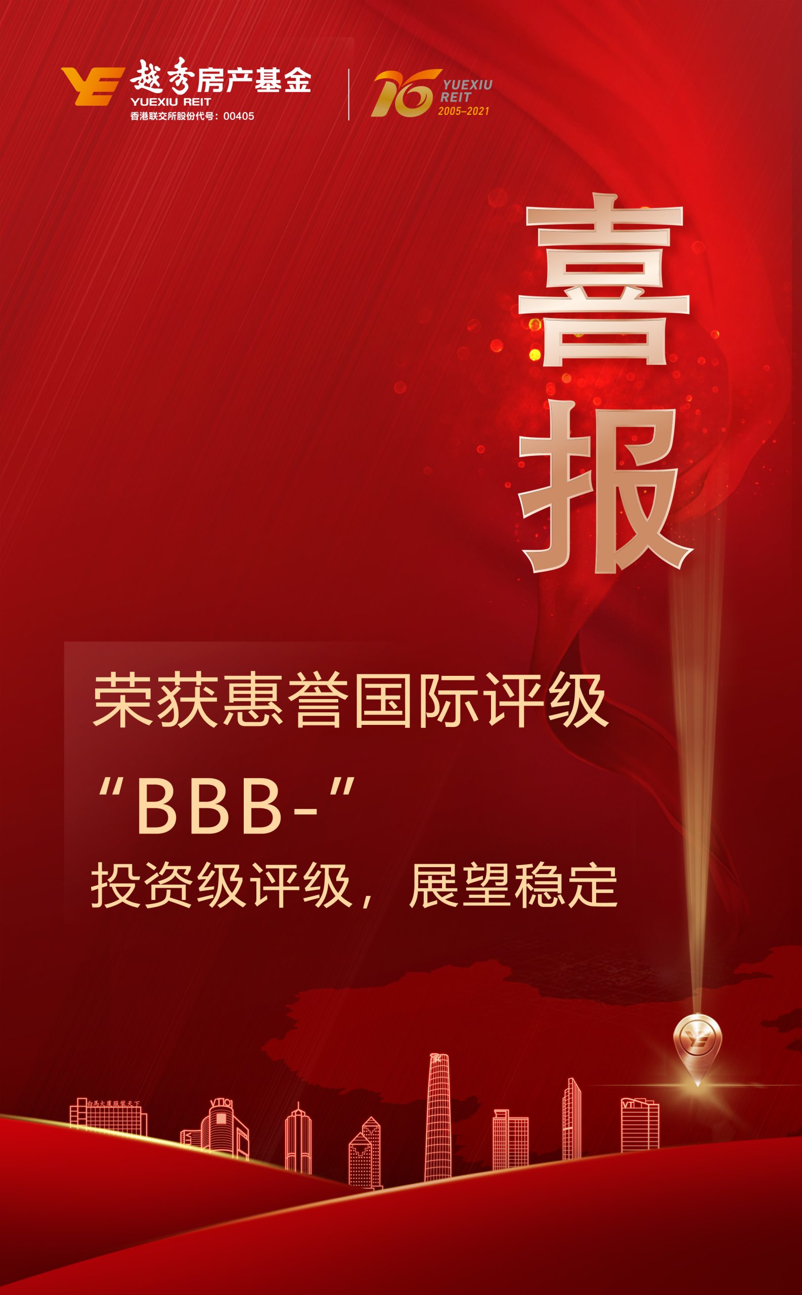 Ltd,简称:“越秀房产基金”,00405.HK)首获惠誉国际评级为“BBB-”长期发行人违约评级(IDR),外币高级无抵押“BBB-”评级,展望为“稳定”,该评级成绩来之不易。